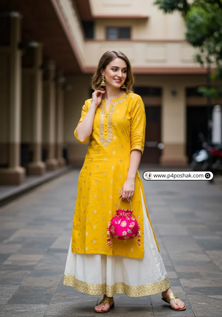Shop Now from Amazon: Yellow A-Line Kurti + White Long Skirt + Golden Sandals + Pink Potli Bag