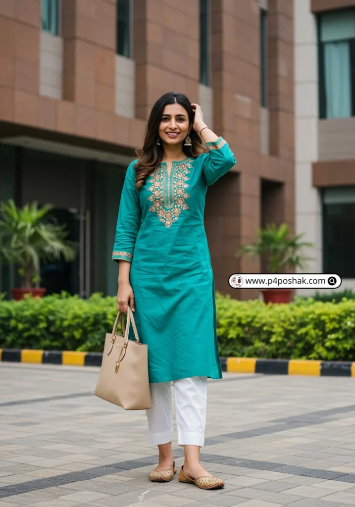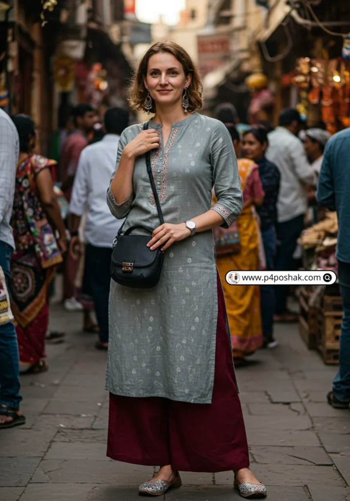 Effortless and practical, a straight kurti with palazzo pants is every Indian woman’s go-to for daily styling. Whether it’s work or casual shopping, this combination gives freedom of movement with a touch of sophistication.