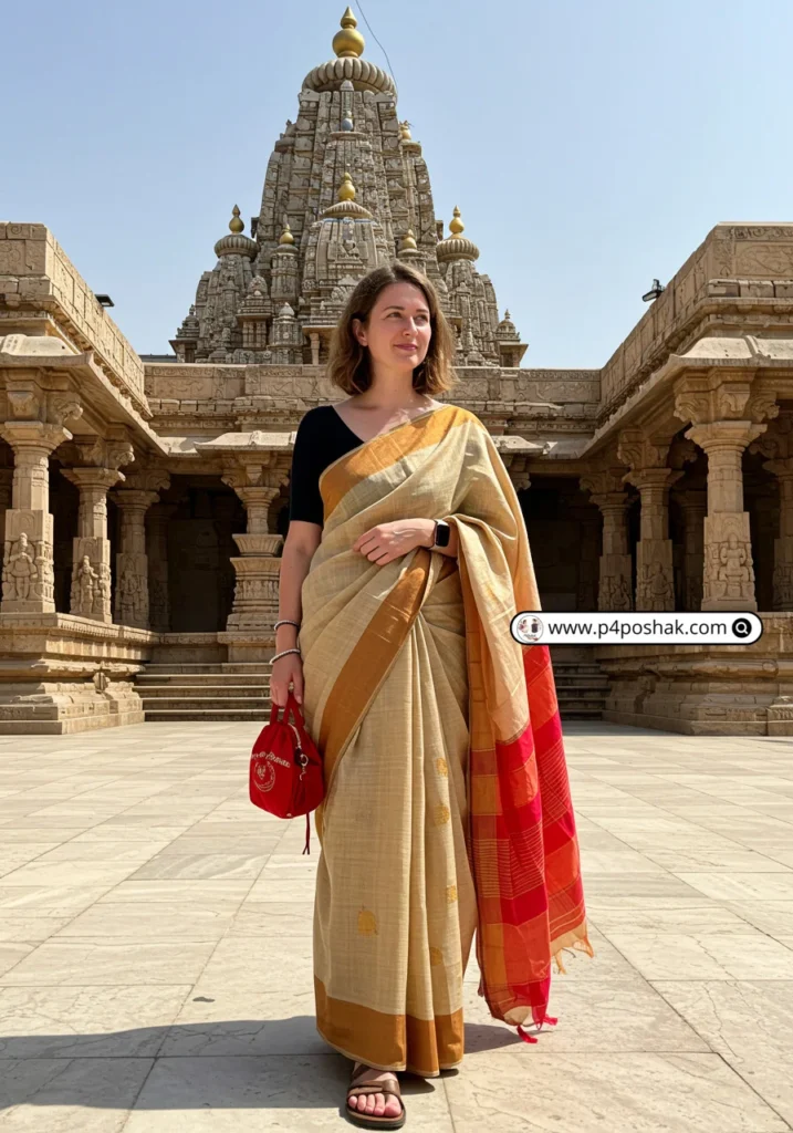 Shop Now from Amazon: Beige Handloom Saree + Black Blouse + Brown Sandals + Red Sling Bag