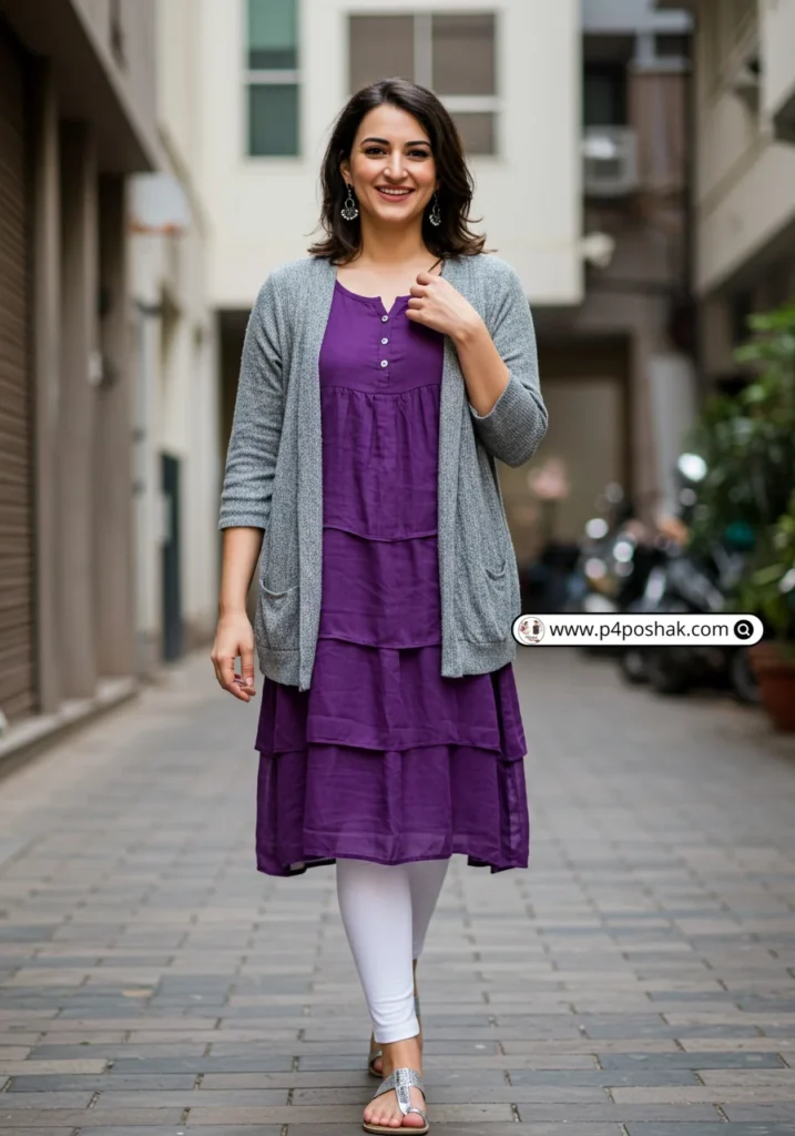 Shop Now from Amazon: Purple Layered Kurti + Grey Shrug + White Leggings + Silver Sandals