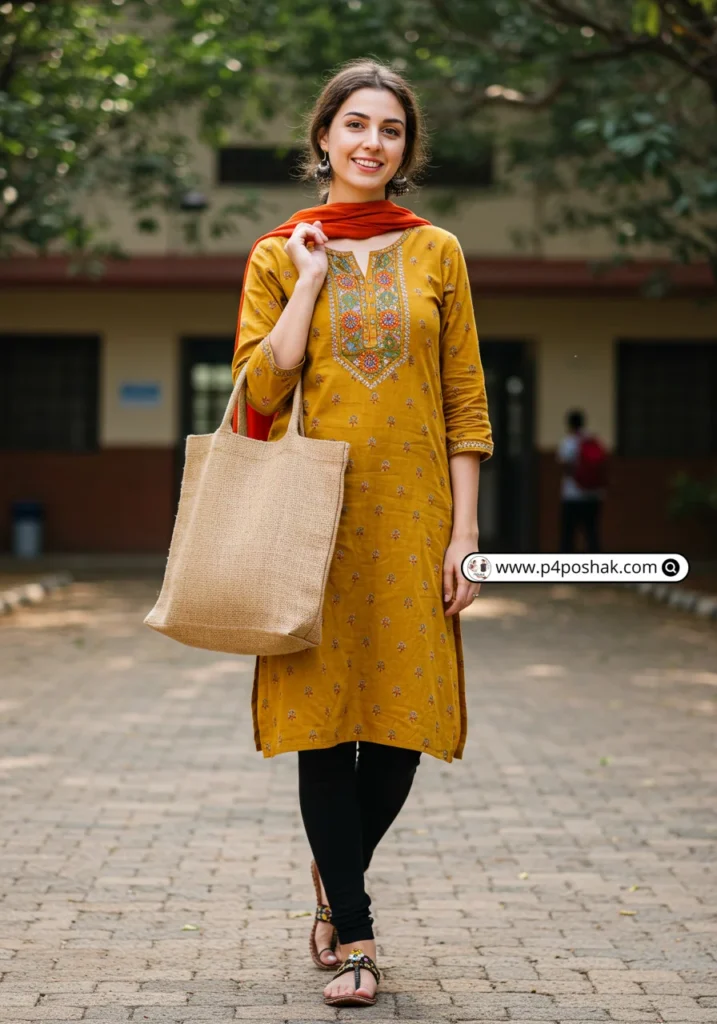The slit kurti gives an edgy touch to traditional wear. When paired with palazzos, it becomes the perfect casual Desi dress for evenings out with friends. It’s trendy, flattering, and always a conversation starter.