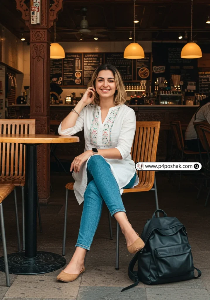 Adding a shrug to your kurti instantly makes it more chic. Perfect for young professionals, this casual Desi dress creates a polished yet comfy vibe. I once wore this look to a friend’s office party—it felt trendy but not too flashy.