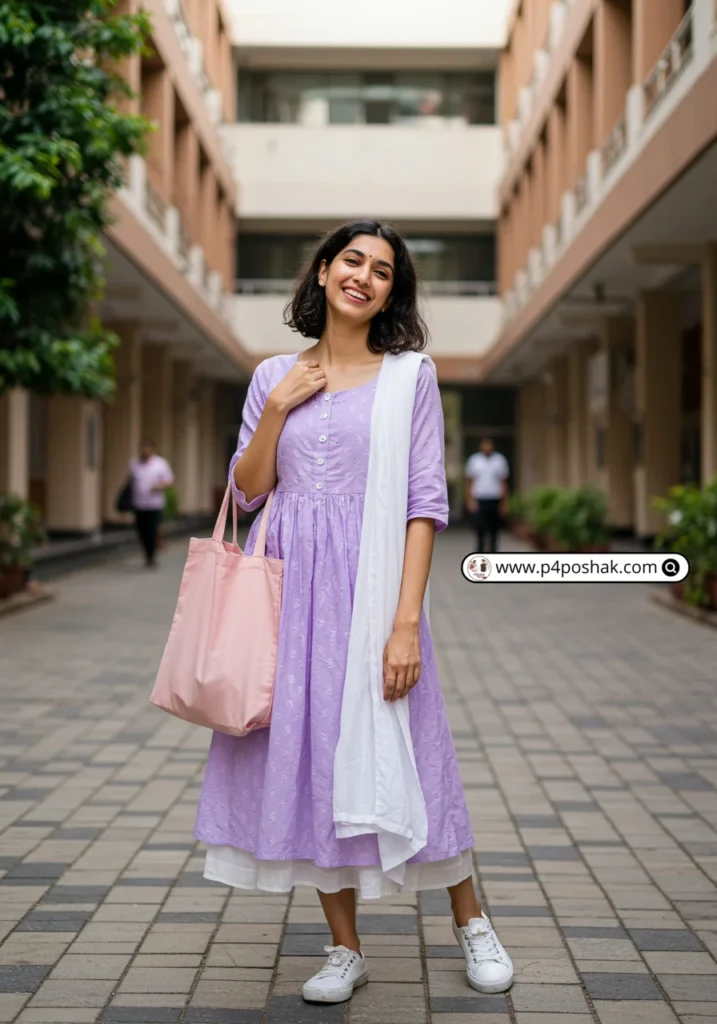 Shop Now from Amazon: Lavender Cotton Dress + White Dupatta + White Sneakers + Pink Tote Bag