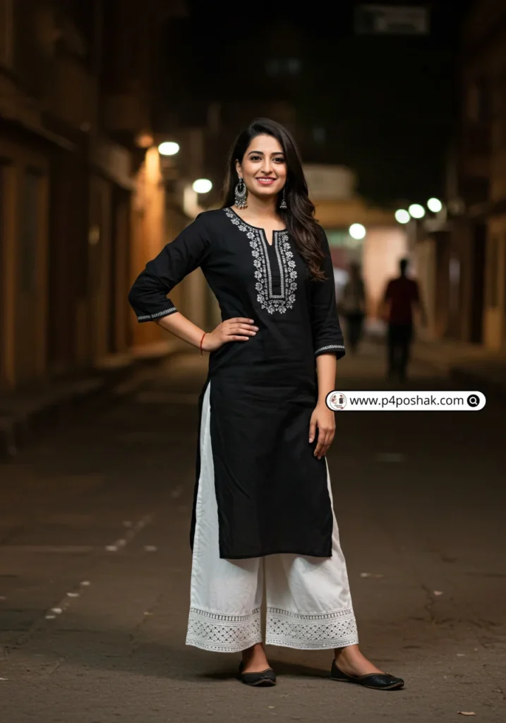 Shop Now from Amazon: Black Slit Kurti + White Palazzo + Silver Earrings + Black Flats