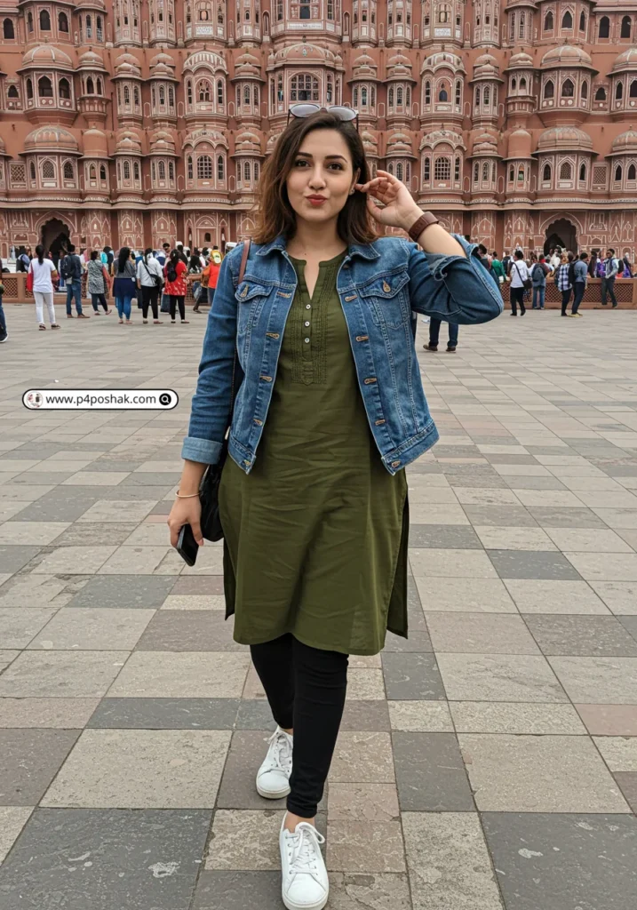 Shop Now from Amazon: Blue Denim Jacket + Olive Green Kurti + Black Jeggings + White Sneakers