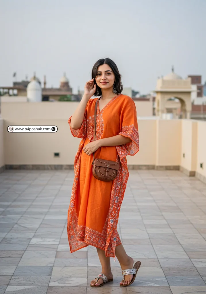 Shop Now from Amazon: Orange Kaftan Dress + Silver Kolhapuri Flats + Brown Sling Bag