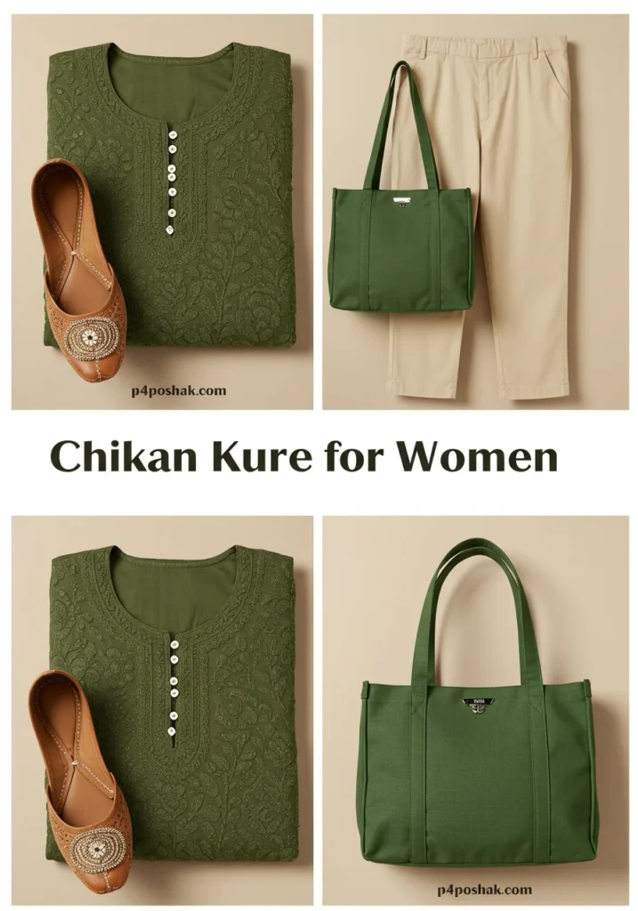 Shop Now from Amazon: Olive Green Chikan Kurta + Beige Pants + Brown Flats + Green Tote Bag