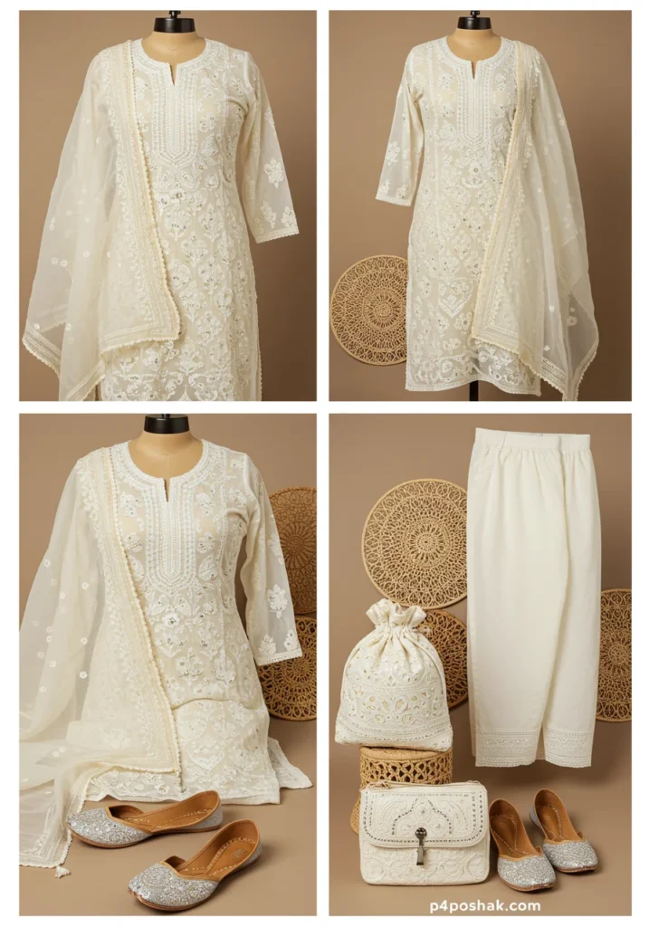 Shop Now from Amazon: Ivory Chikan Kurta + Ivory Dupatta + White Pants + Silver Juttis + Ivory Bag