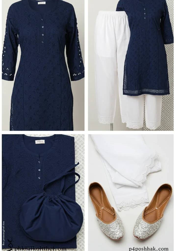 Shop Now from Amazon: Navy Blue Chikan Kurta + White Pants + Silver Juttis + Navy Bag