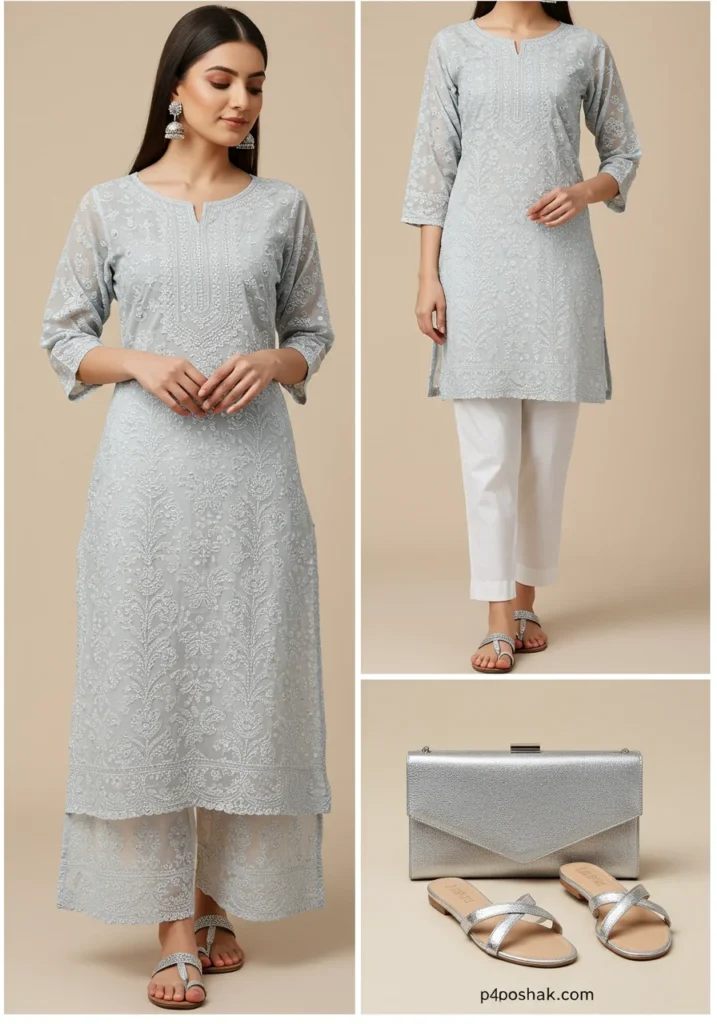 Shop Now from Amazon: Light Grey Chikan Kurta + White Pants + Silver Sandals + Grey Clutch