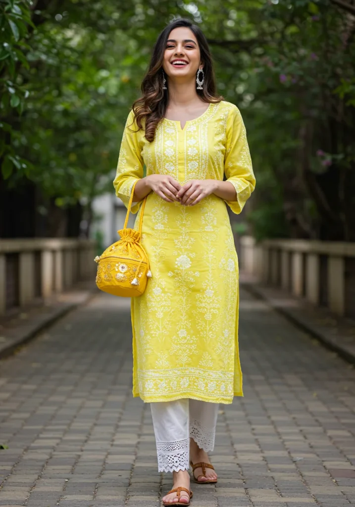 Shop Now from Amazon: Lemon Yellow Chikan Kurti + White Pants + White Flats + Yellow Potli Bag