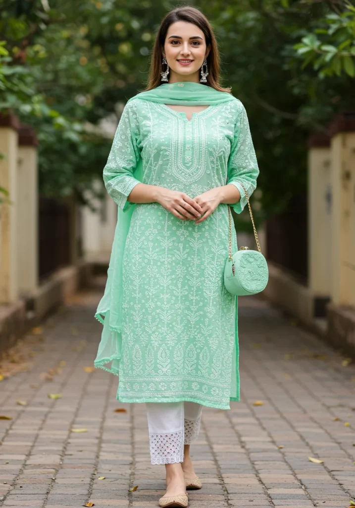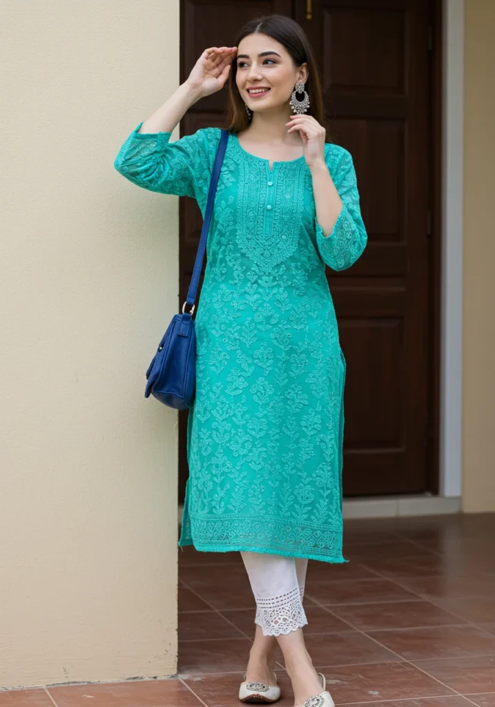 Pairing a chikan kurti with jeans creates a chic Indo-western look. Perfect for college, coffee dates, or casual outings, this combination balances comfort and contemporary style. (Author Experience: Rolling up the sleeves adds a trendy edge!)