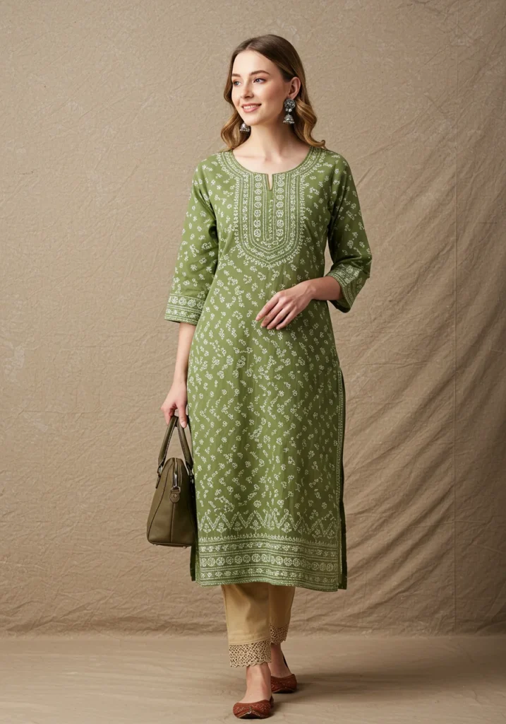 Shop Now from Amazon: Olive Green Chikan Kurti + Beige Pants + Brown Flats + Olive Handbag