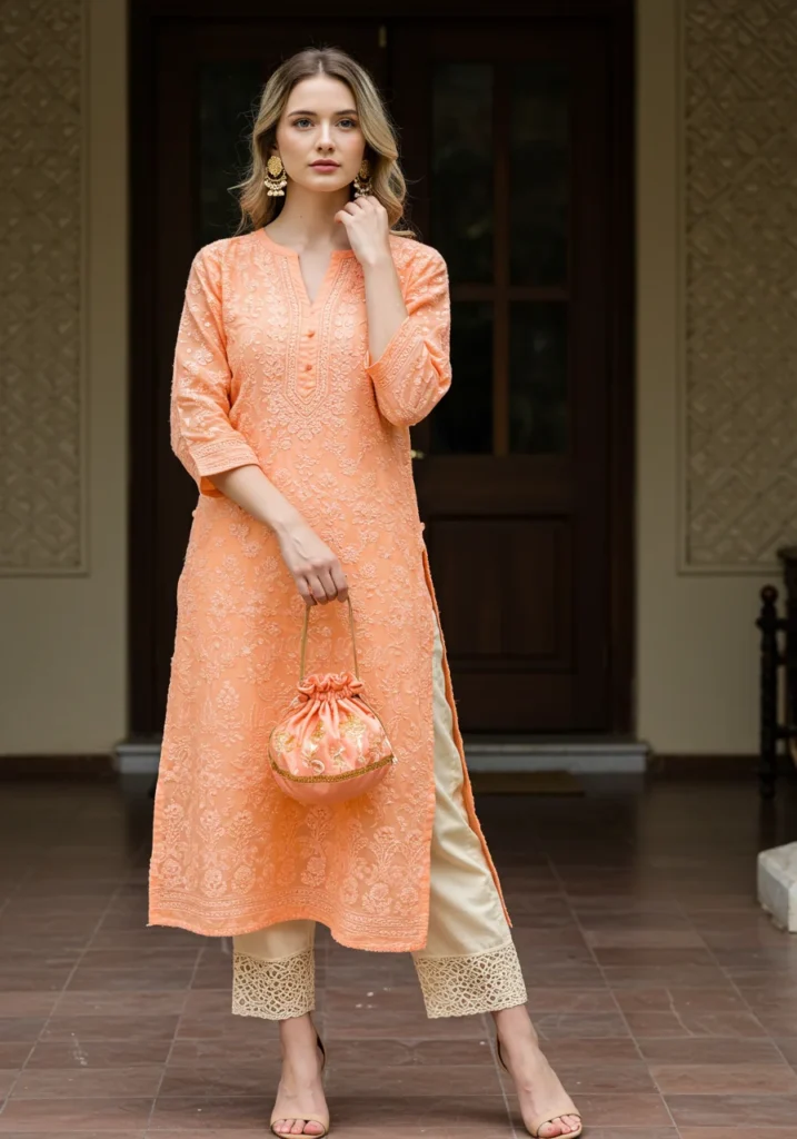 Shop Now from Amazon: Peach Chikan Kurti + Cream Pants + Nude Heels + Peach Potli Bag