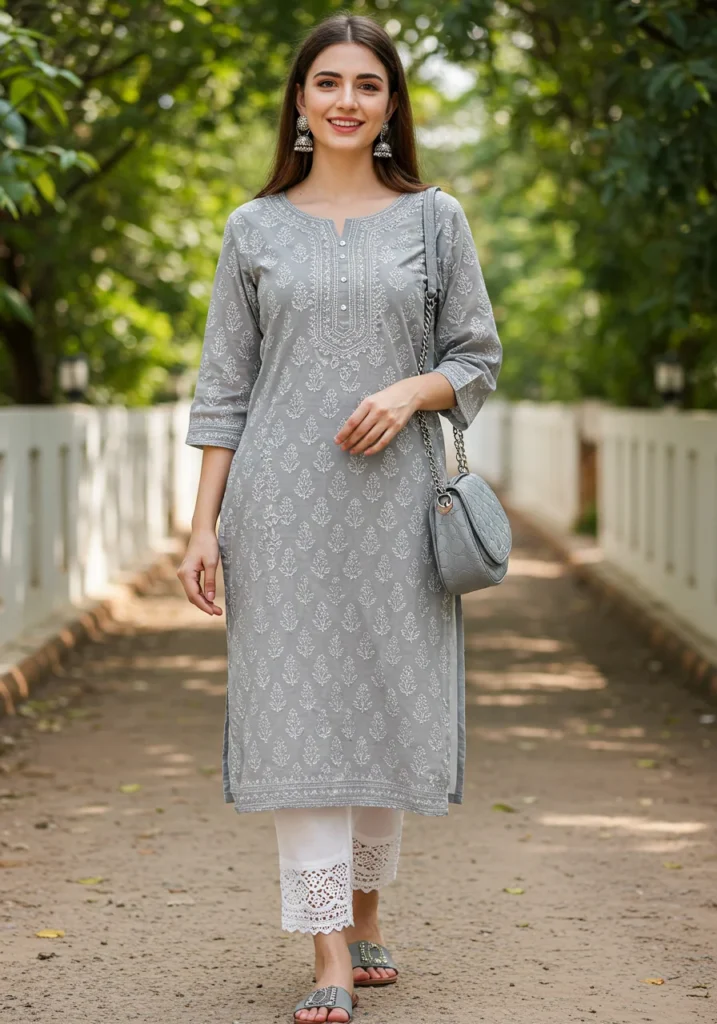 Shop Now from Amazon: Grey Chikan Kurti + White Pants + Grey Flats + Grey Sling Bag