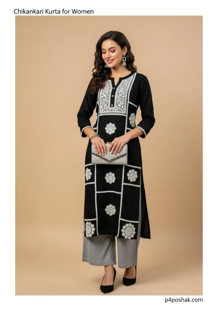 Black panelled chikankari kurta for women is sophisticated and versatile. Perfect for evening dinners or office parties. Panels add structure while palazzos ensure comfort. Author tip: A sleek hairstyle enhances the modern look.