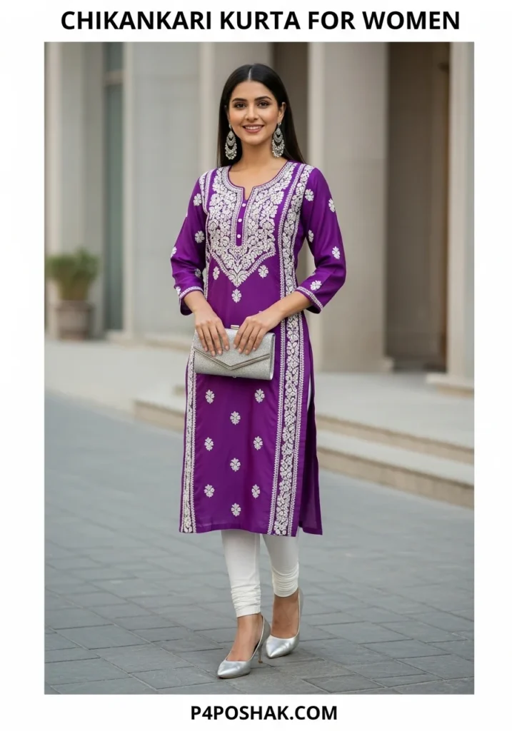 Violet silk chikankari kurta for women is ideal for evening parties or festive gatherings. Luxurious silk fabric adds sophistication while leggings provide comfort. Tip: Pair with silver accessories to complete the party-ready look.