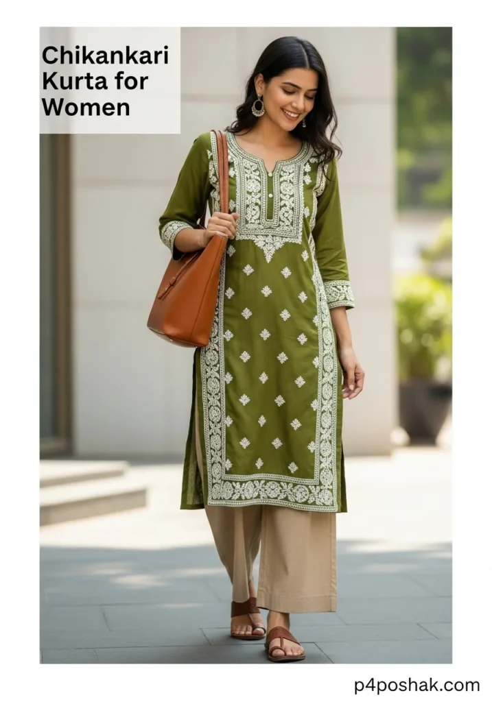 Olive green straight chikankari kurta for women is ideal for office or casual outings. Straight cut offers a polished, professional look. Pair with palazzos for modern flair. Author advice: Minimal jewelry keeps the outfit elegant yet effortless.