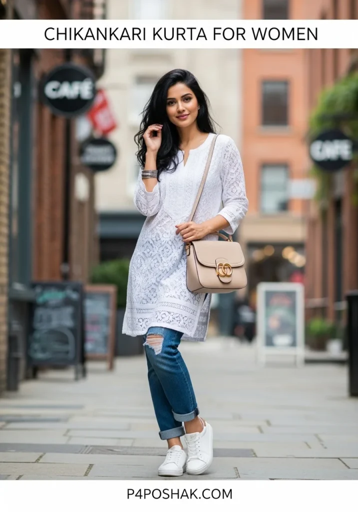 White lace chikankari kurta for women is delicate and versatile. Lace embroidery adds sophistication while jeans ensure comfort for casual outings. Ideal for brunch or casual office days. Author experience: Perfect for informal Fridays at work.