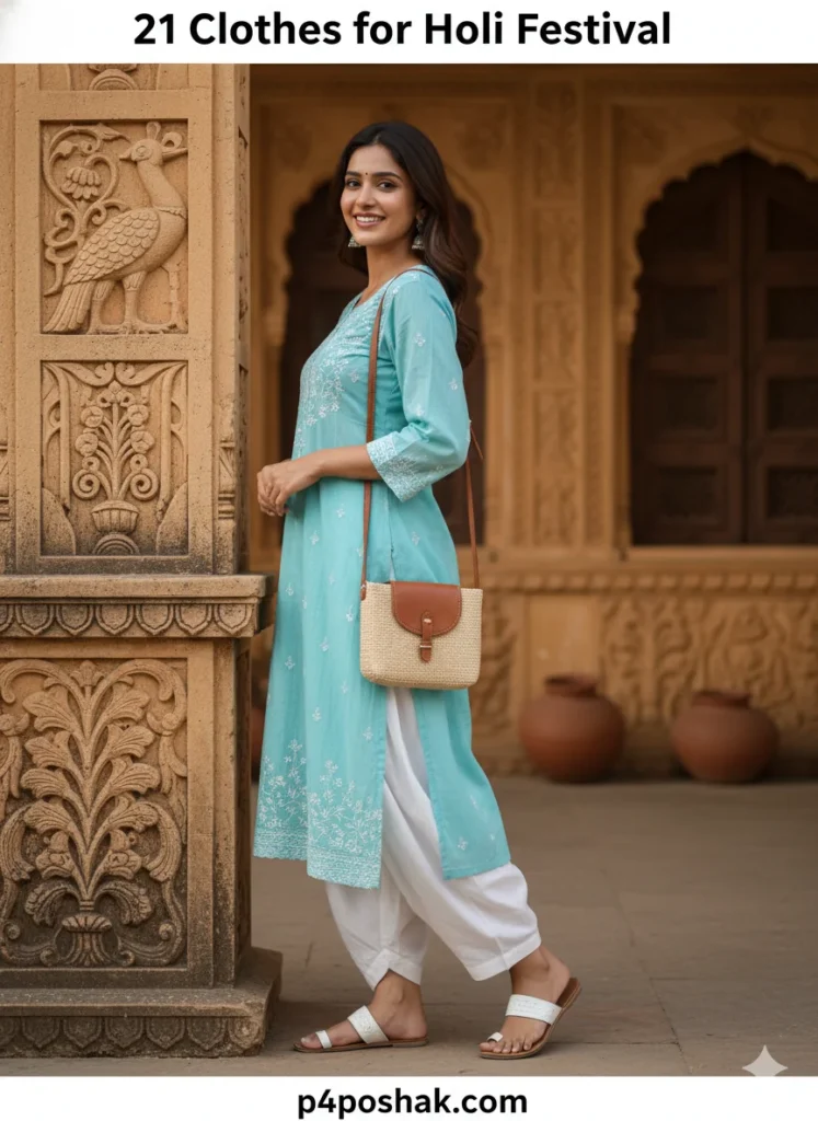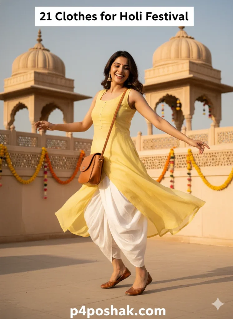Dhoti pants paired with a kurti give a modern ethnic look while providing full comfort. Cotton ensures breathability during outdoor Holi games. My tip: keep accessories minimal to avoid them getting stained.