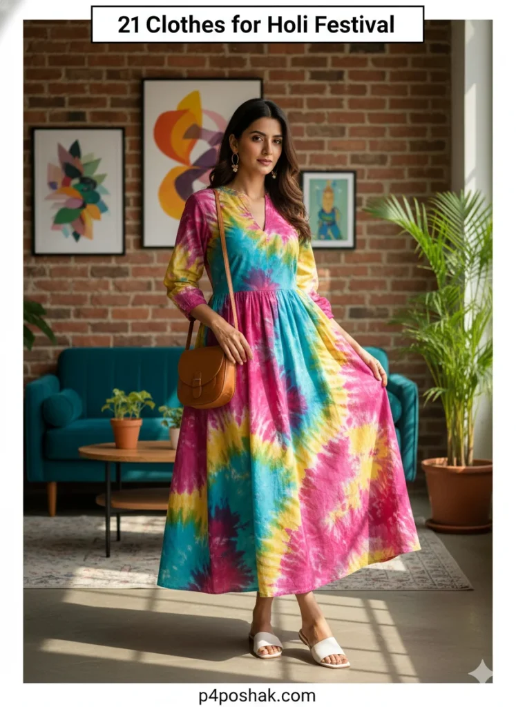A tie-dye dress already reflects the spirit of Holi, making it both stylish and practical. One-piece outfits are great for women who want zero styling effort. I personally recommend dresses for casual outdoor Holi parties.
