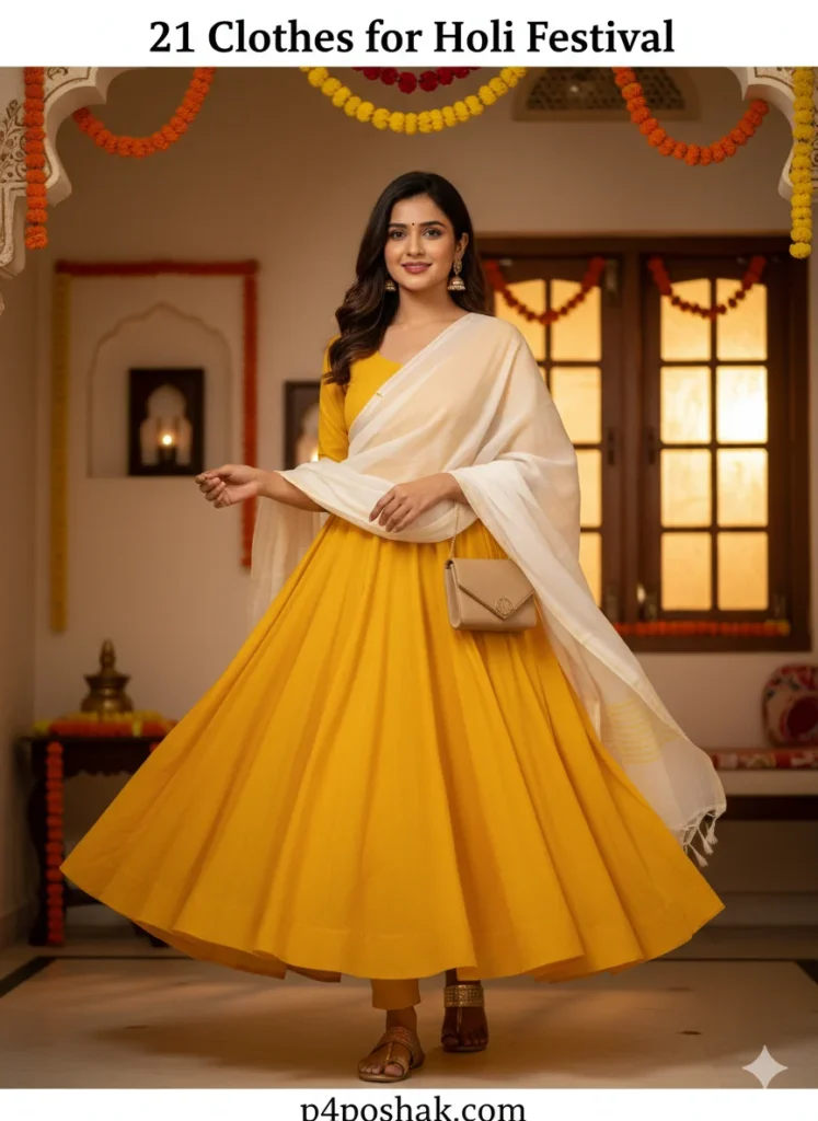 Anarkali dresses offer a festive and graceful look while staying lightweight. The bright yellow shade brings cheerful vibes, perfect for Holi mornings. Based on my styling tips, pairing with minimal jewelry keeps the outfit practical and fun.