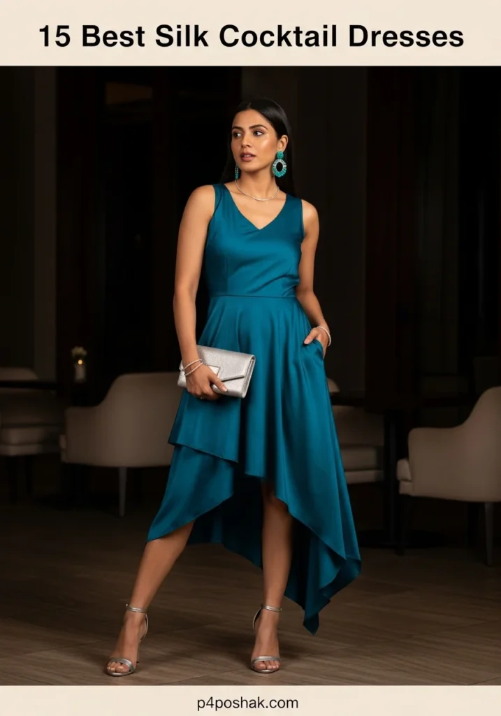 Asymmetrical cuts add drama to silk cocktail dresses. This teal blue piece feels bold yet elegant, perfect for fashion-forward women. Keep accessories minimal to maintain balance.