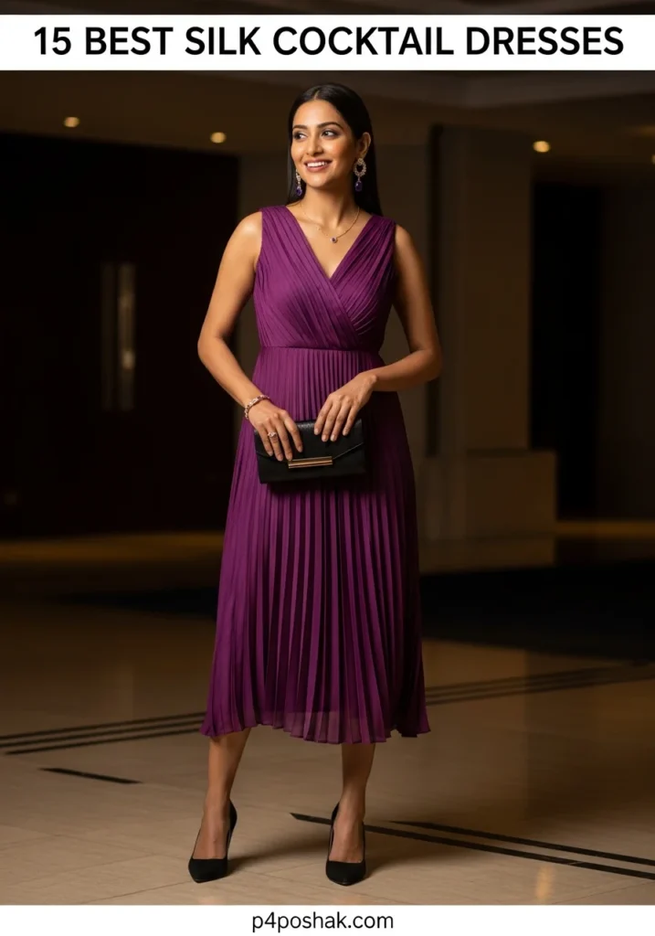Pleated silk cocktail dresses are stylish yet forgiving. This plum version offers comfort during long events while keeping your look polished. Perfect for women who love structure without stiffness.
