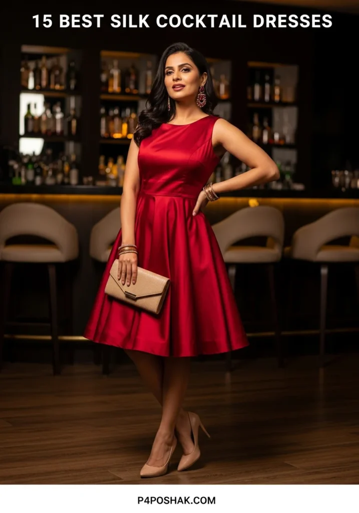 Red silk cocktail dresses symbolize confidence and power. The fit-and-flare shape gives comfort while enhancing femininity. It’s my go-to recommendation for women attending festive cocktail nights or anniversary celebrations.