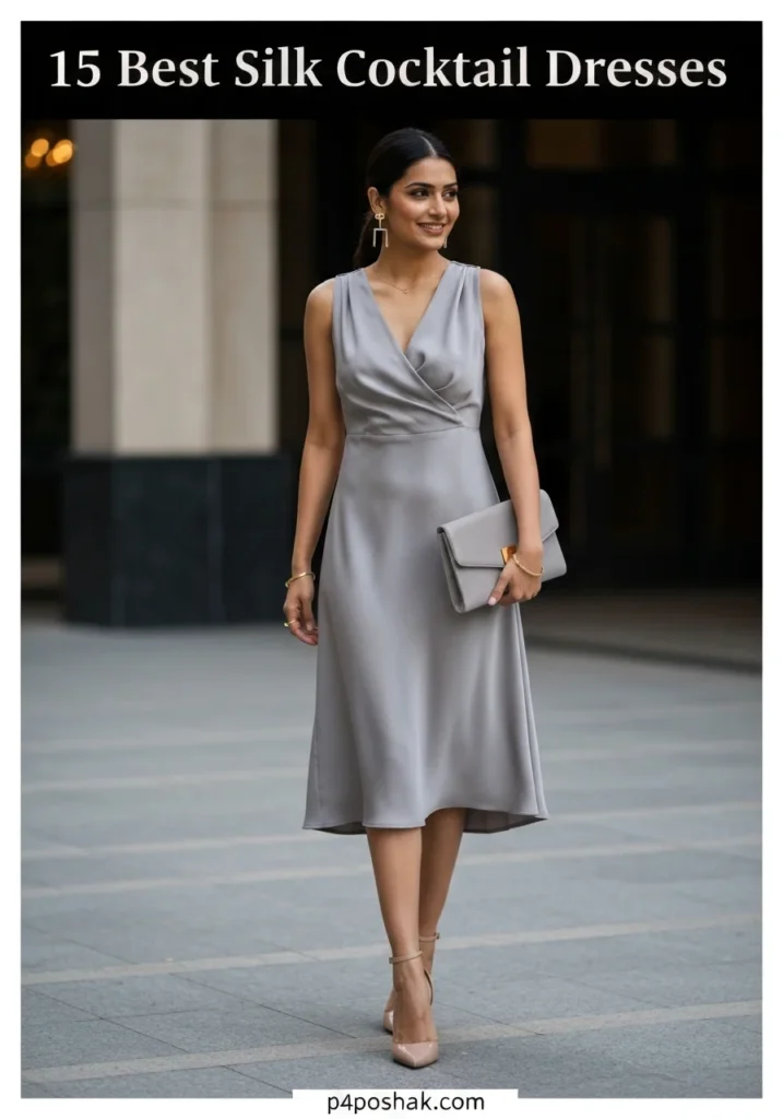 Minimal silk cocktail dresses like this soft grey piece are timeless investments. Comfortable, breathable, and elegant, it’s perfect for women who value subtle luxury over loud trends.