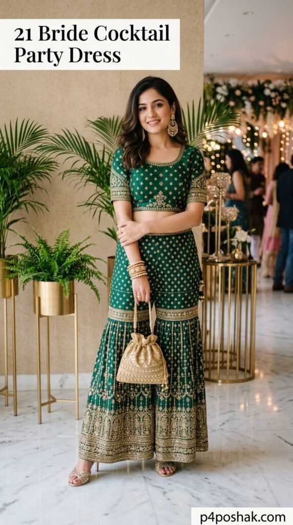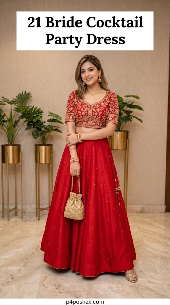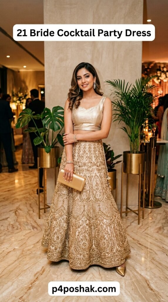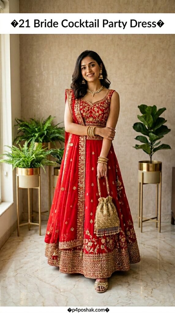 The pre-stitched saree gown is one of the most practical yet fashionable bridal cocktail outfits. It offers the elegance of a saree with the comfort of a gown. Many modern brides choose this style because it allows easy movement during dancing and celebrations.