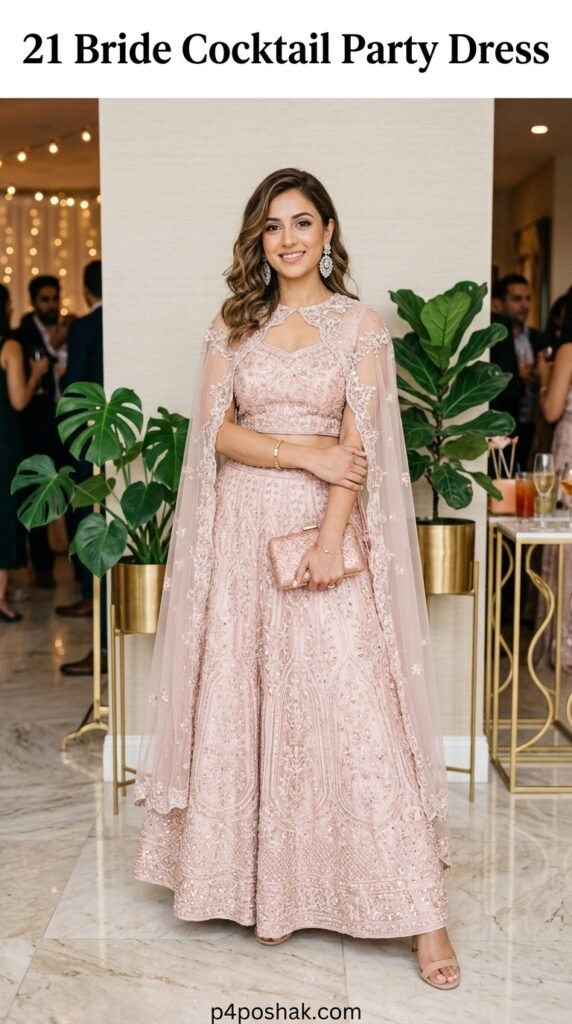 A cape lehenga replaces the traditional dupatta with a sheer embroidered cape, creating a dramatic and modern bridal silhouette. Fashion stylists note that cape styles feel lighter and easier to carry during cocktail celebrations while still maintaining elegance.