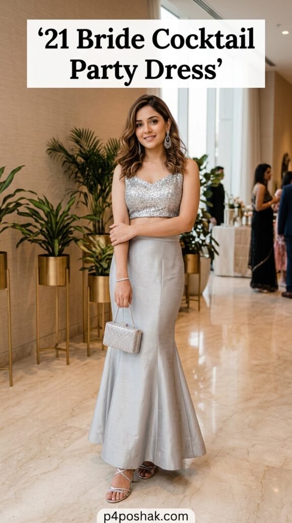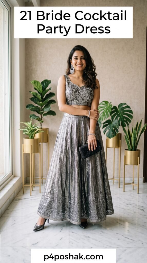 A metallic sequin lehenga instantly creates a glamorous bridal cocktail appearance. Silver tones sparkle beautifully under evening lights and look incredible in photos. Many designers featured on Brides say metallic lehengas are among the biggest cocktail trends for modern brides.