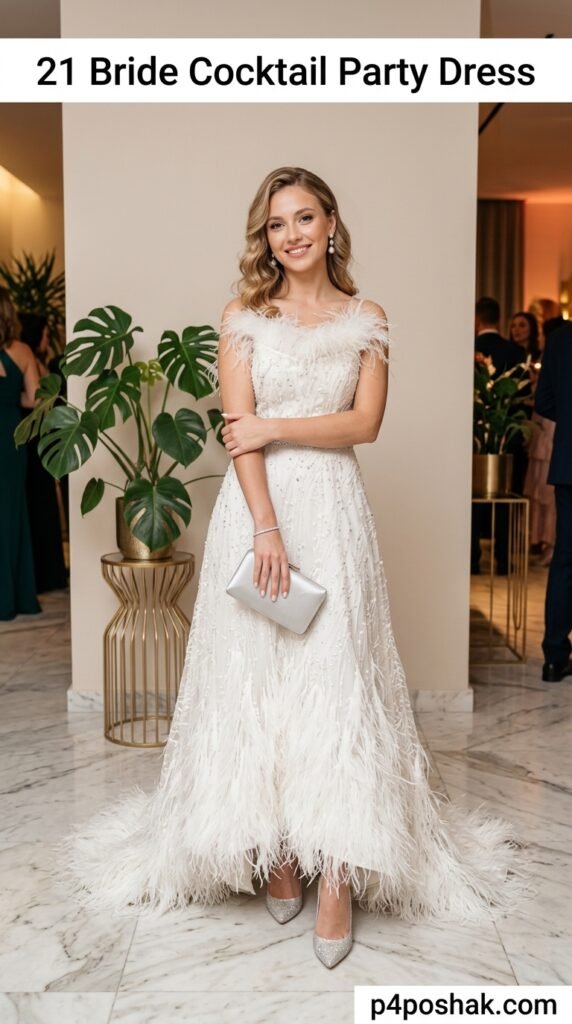Feather-trim gowns give brides a luxury red-carpet style for cocktail parties. The delicate feather details add movement and drama. Many fashion editors recommend this glamorous style for brides who want a western-inspired yet sophisticated evening look.