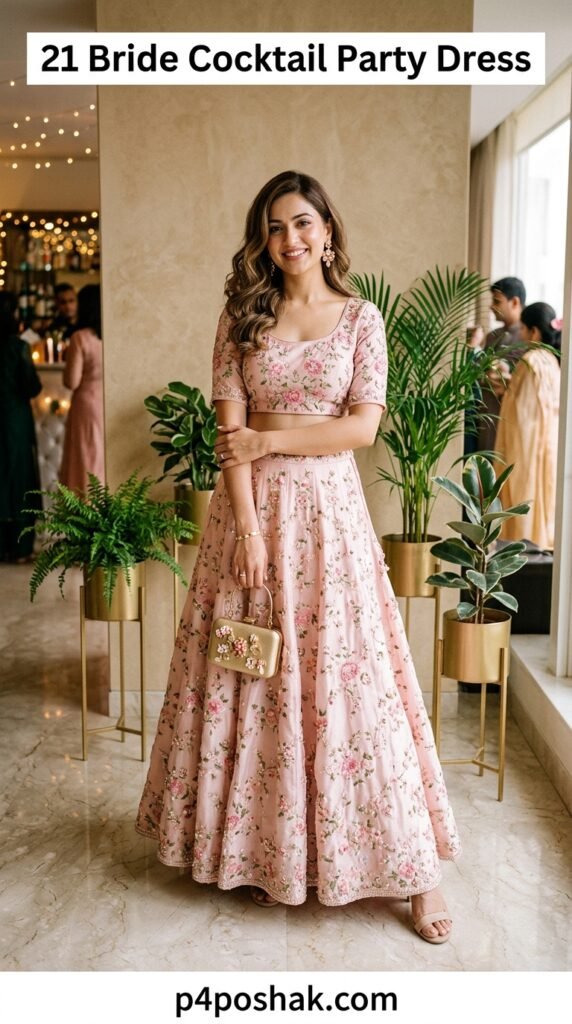 Pastel floral lehengas bring a soft romantic vibe to bridal cocktail events. Floral prints and delicate embroidery make the outfit feel dreamy yet fashionable. Designers frequently use pastel tones because they photograph beautifully in evening celebrations.