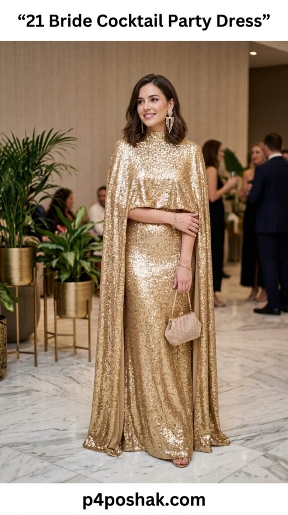 Cape gowns are one of the most fashionable bridal cocktail outfits today. The cape creates a flowing, regal effect that looks stunning in photographs. Fashion designers love this silhouette because it blends glamour with comfort.