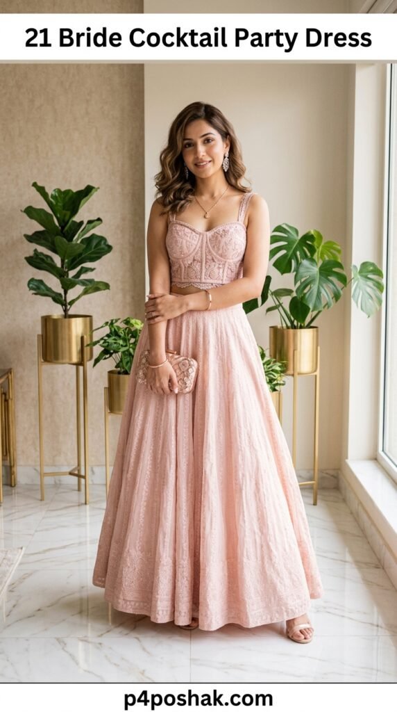 Corset or bustier blouses paired with flowing lehenga skirts are among the most Instagram-popular bridal cocktail styles. The structured blouse creates a flattering silhouette while the skirt adds softness and movement, perfect for glamorous wedding photos.