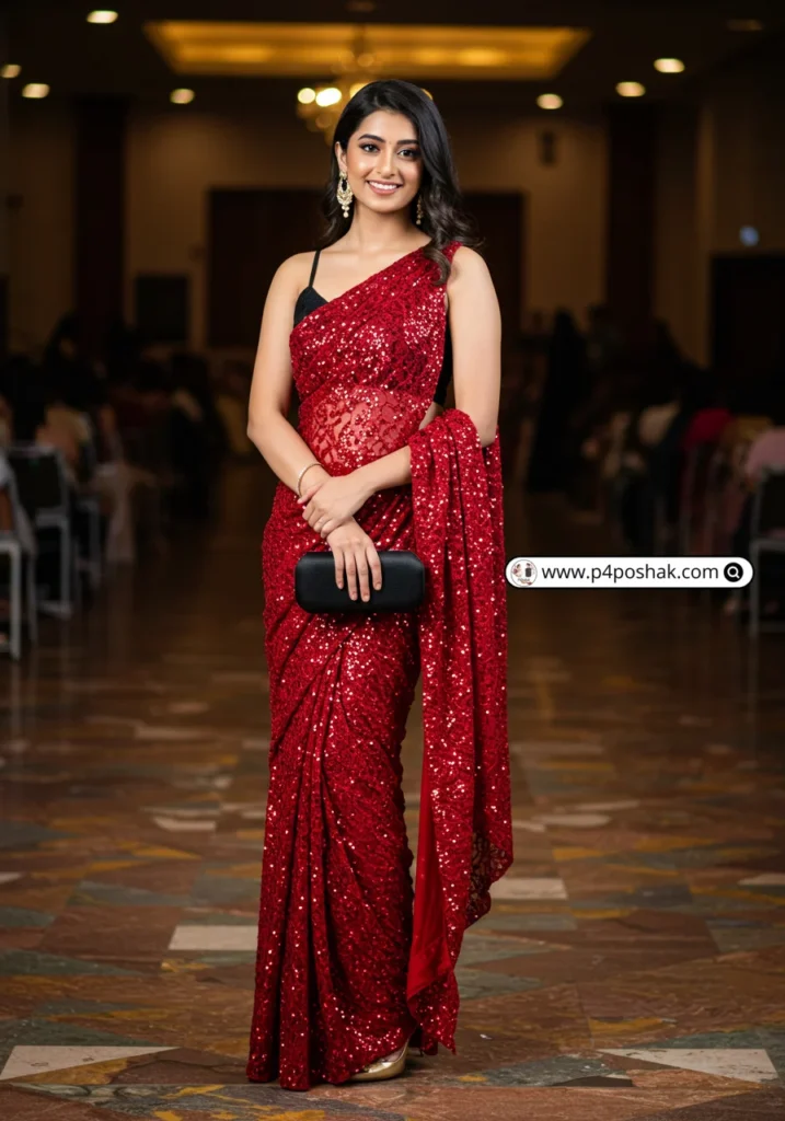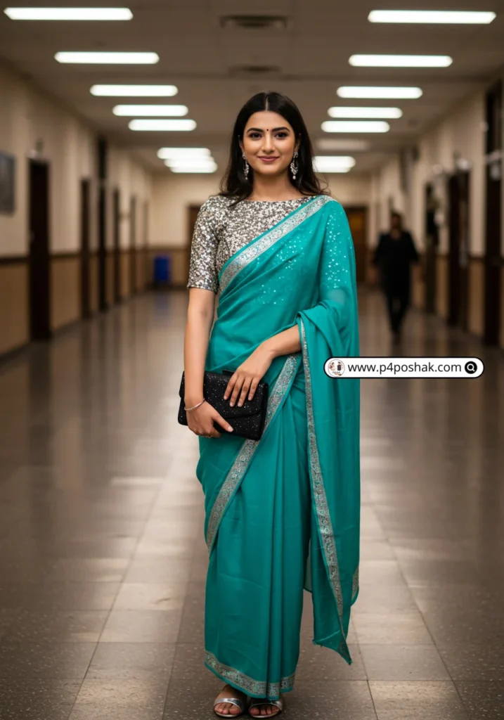 This saree is timeless yet trendy. Sequins add glam under the farewell lights. As Femina highlights, shimmer sarees are 2025’s hottest evening trend—perfect for making that last impression.