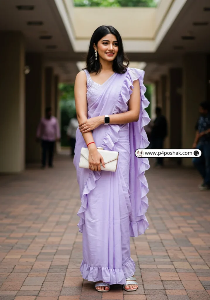 Ruffles add drama and playfulness. A lilac saree feels soft, feminine, and Instagram-perfect. Femina India notes that ruffled sarees are a hot Gen-Z trend—perfect for farewell vibes.