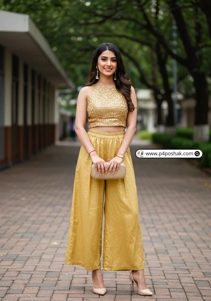 Shop Now from Amazon: Golden Crop Top | Golden Palazzo Pants | Beige Heels | Golden Clutch