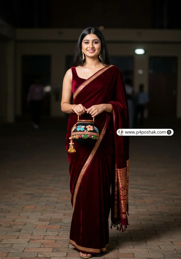 Velvet is luxurious and perfect for winter farewells. According to Vogue India, velvet sarees are making a comeback in festive and party wear. This one adds richness with minimal effort.