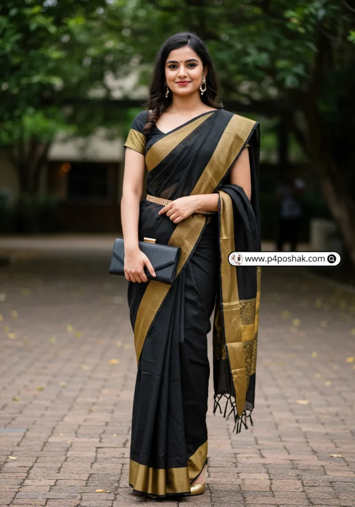 Nothing beats the charm of a black saree. The golden border elevates the look instantly. As my senior once told me—“A black saree is every girl’s secret weapon.”