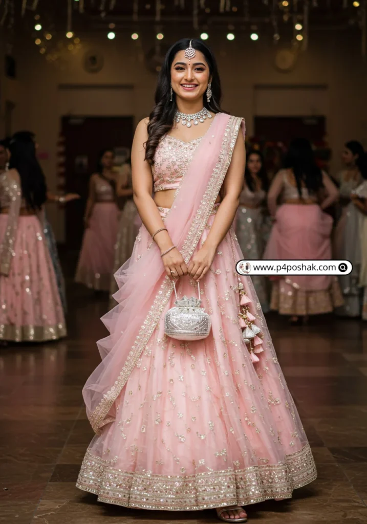 A pastel pink lehenga feels dreamy and romantic. Perfect if you want princess vibes without going over the top. Harper’s Bazaar India calls pastel lehengas “the modern millennial bride’s pick,” but they’re equally magical for farewells.