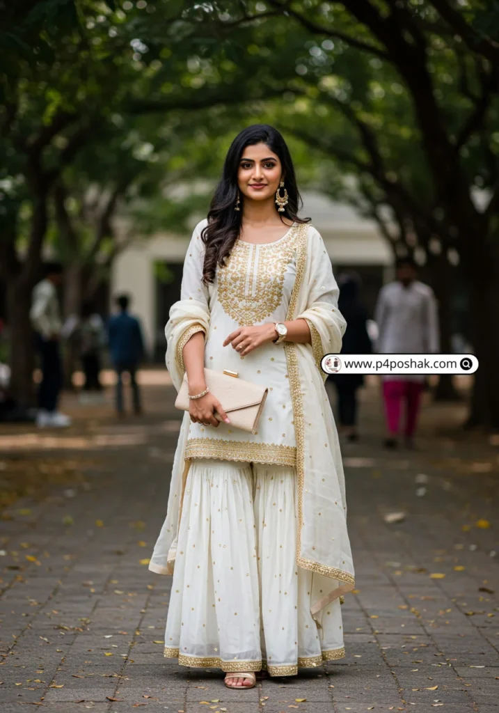 A white sharara set with light embroidery balances elegance and comfort. I wore one to my friend’s farewell, and it stood out against the colorful crowd—subtle yet glamorous.