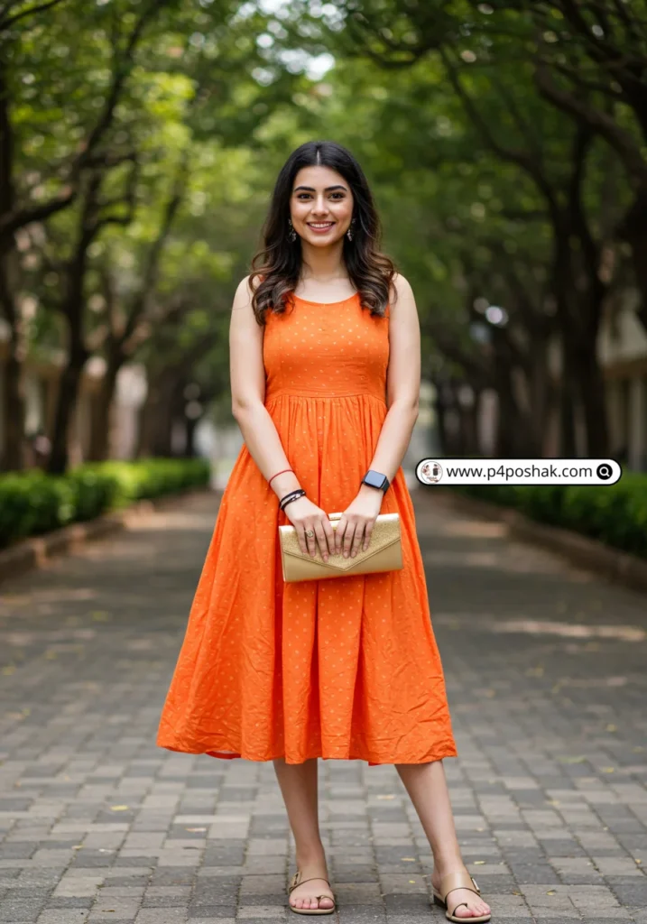 Shop Now from Amazon: Orange Indo Western Dress | Beige Sandals | Golden Clutch