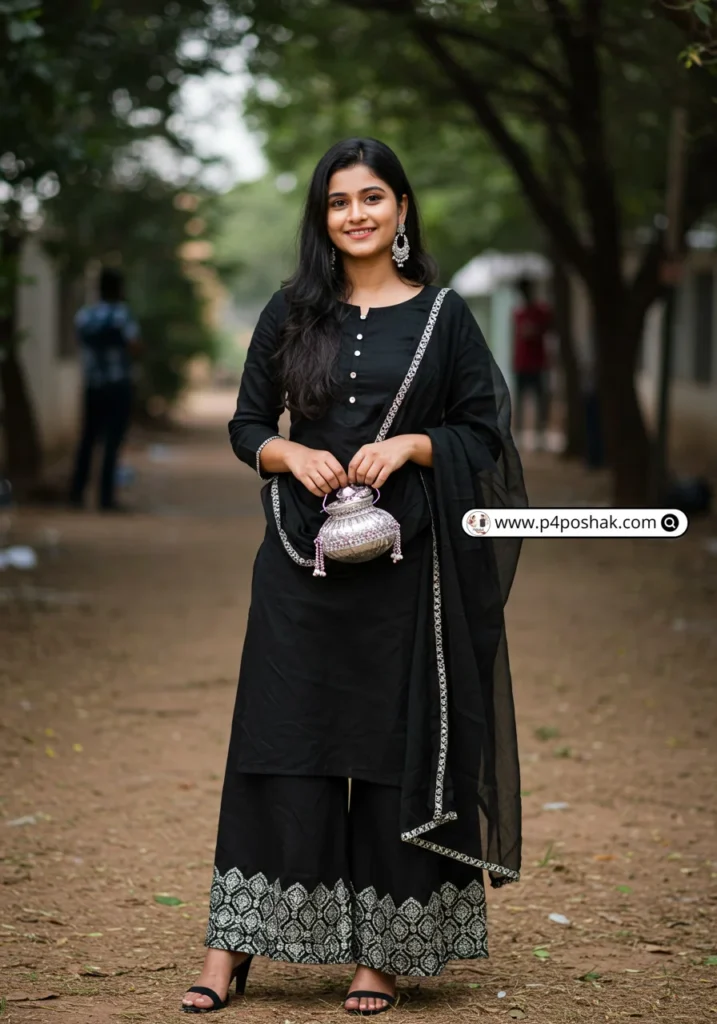 Shop Now from Amazon: Black Palazzo Suit | Black Heels | Silver Potli