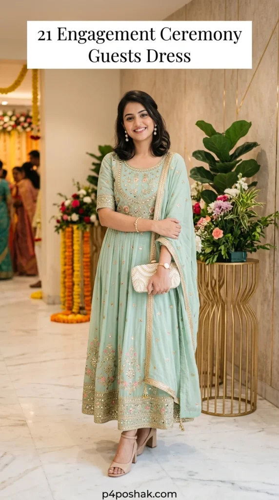 A pastel Anarkali is one of the most graceful choices for an engagement function. The flowing silhouette looks flattering on almost everyone, while the soft mint shade adds freshness. Pairing it with neutral heels and a pearl clutch creates a sophisticated guest-ready look.