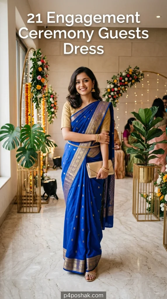 A silk saree is timeless for engagement celebrations. The royal blue shade adds vibrancy while the gold blouse enhances the traditional aesthetic. This look works beautifully for formal family functions and photographs wonderfully under evening lighting.