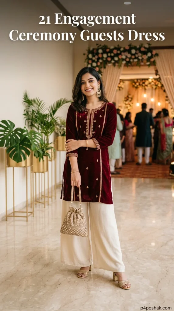 Velvet instantly adds richness to engagement attire. A deep maroon kurta paired with cream palazzo pants creates a regal contrast. This outfit is perfect for winter or evening ceremonies and adds a luxurious festive vibe without appearing overly bridal.