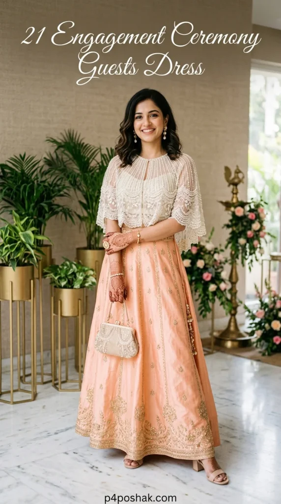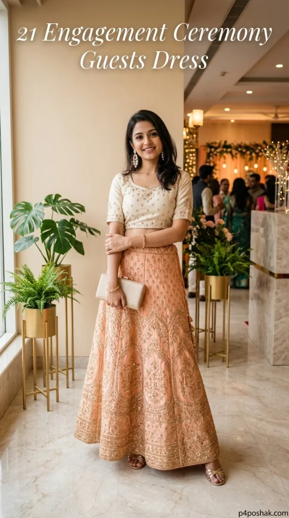 A light embroidered lehenga makes a stunning engagement guest outfit. The peach tone looks romantic and festive without competing with bridal wear. This style works especially well for evening engagement parties or grand banquet celebrations.